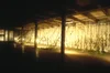 Installation overview October 1997, The Chair Building, Kansas City, MO, uprooted and inverted castor plants, steel hooks, drawings, light-Derek Porter Studio, 12,000 sq feet of darkness with plants in lighted area, 70’ x12’ x 7’, drawings 11’ x 30’.