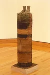 CORE SAMPLE: SELF PORTRAIT1994earth from every place I've lived, 1" equals 1 year, earth from Missouri, Louisiana, Illinois, Alabama, Minnesota, Maine, Missouri, Glue, life cast bronze of my feet , cylinder, 43" x 12".