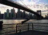 Child lifting child to see the framed view of Brooklyn Bridge.